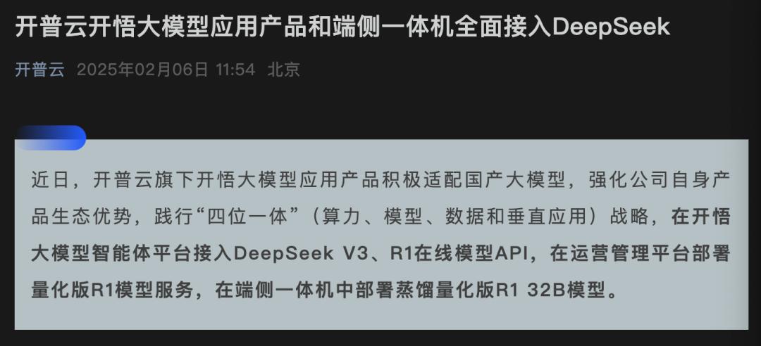 開普云則宣布在開悟大模型智能體平臺(tái)接入DeepSeek V3、R1在線模型API,在運(yùn)營管理平臺(tái)部署量化版R1模型服務(wù),在端側(cè)一體機(jī)中部署蒸餾量化版R1 32B模型。