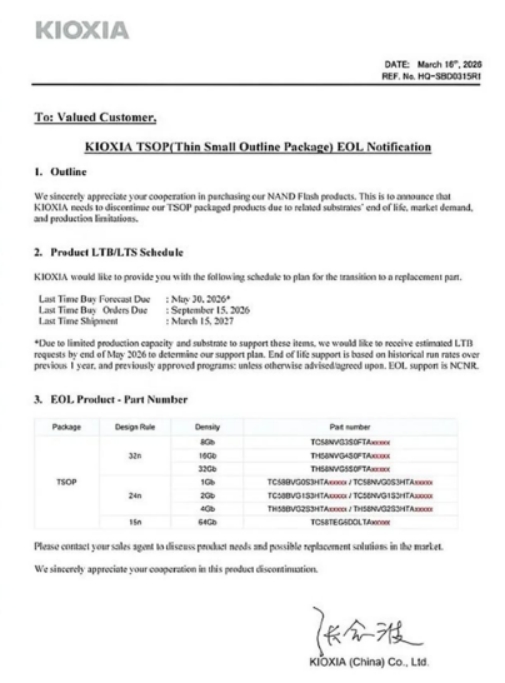由于生產(chǎn)能力和基材限制,鎧俠表示,公司無法生產(chǎn)8Gb-64Gb的TSOP封裝產(chǎn)品。希望收到最后采購預(yù)測(cè)(即客戶最后一次下單數(shù)量)期限為2026年5月30日,以確定鎧俠的支持計(jì)劃。最后采購訂單截止日為2026年9月15日,最后出貨時(shí)間為2027年3月15日。